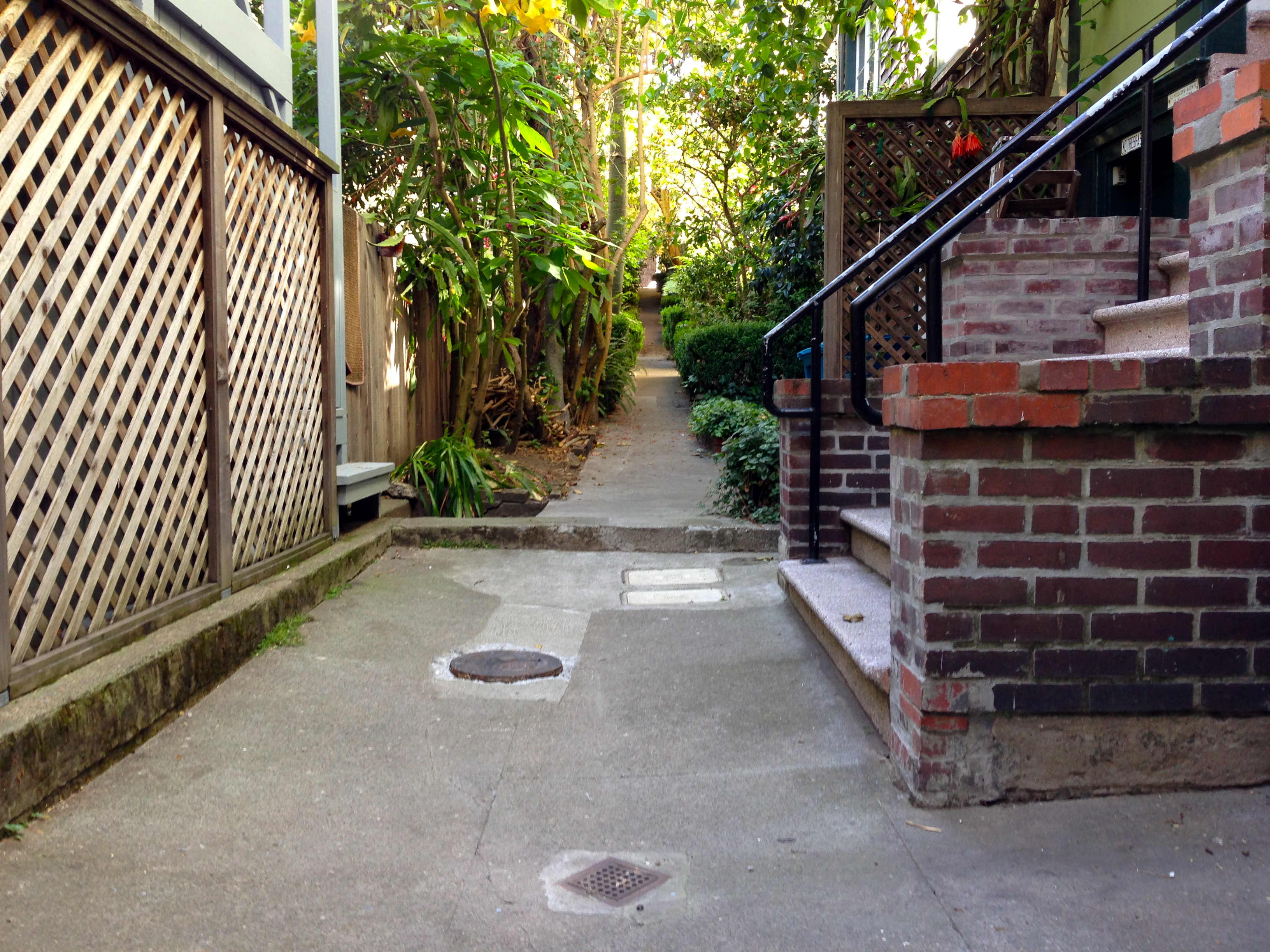 On June 24, 1866 John married Ellen McCarthy in Boston, Mass. and the following year they moved to San Francisco where John’s sister, Ellen Kelly, and her husband Lawrence, had moved before the war, establishing a homestead on the NE end of Leroy Place.* Four more brothers would follow John’s footsteps over the next ten years,^ but on John and Ellen’s arrival in S.F., it’s quite possible that Lawrence Kelly, who was working as a cartman and teamster, helped John get a job as a groom for Mayor Henry P. Coon‘s horses. In 1868, John and Ellen were living on Clay Street between Hyde and Leavenworth and John was appointed by the city as keeper of Washington Square Park in North Beach.+ Though John and Ellen possibly lived a spell on Bernard Street on Russian Hill as well, around 1873, John bought a building lot that was located 130 feet or so off the south side of Sacramento Street, between Leroy and Leavenworth. With its access point between two buildings on Sacramento Street, a pathway was instituted.@