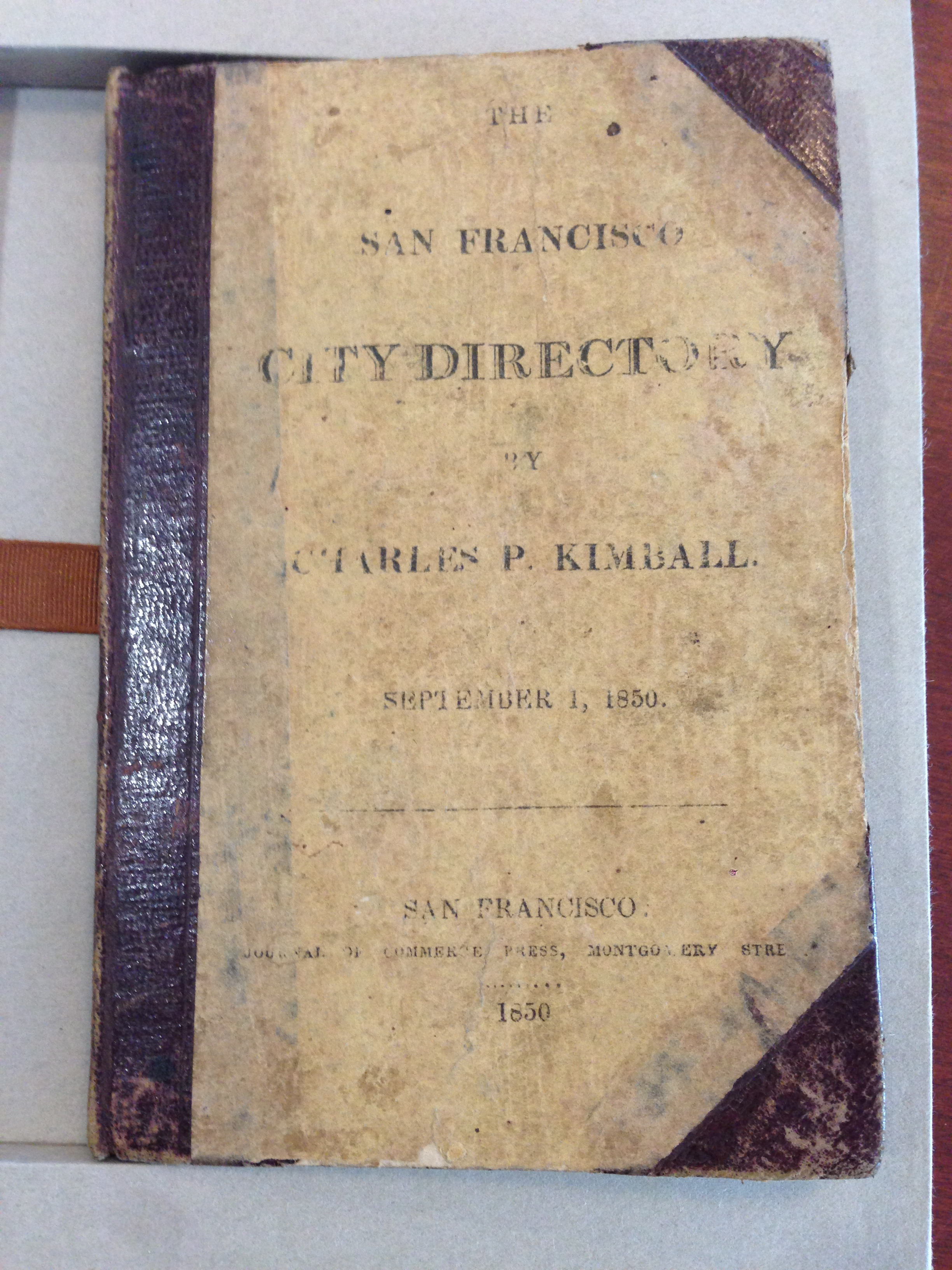 Last week I met with the librarian at the Society of California Pioneers. While mainly doing research for a piece I’m working on, I received more info on Charles P. Kimball as well. Likewise, I was given the opportunity to handle and take photographs of Kimball’s copy of his San Francisco City Directory from 1850, i.e. the first city directory of San Francisco.