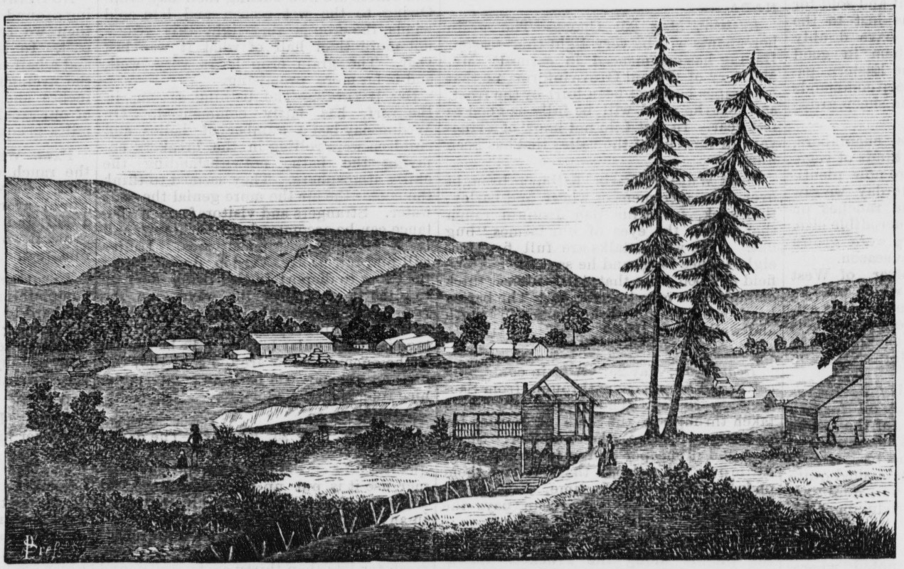 To the north of the gold country was Bidwell’s Bar, a camp started by John Bidwell, founder of Chico, Calif., who at one time worked at Sutter’s Fort, and was the one that drew up the contract between Sutter and Marshall to build the saw mill.-*- After visiting Sutter’s Fort in early-1848 and learning the news, Bidwell checked out Coloma, returned to Chico, got together a prospecting party, and headed down to the fork in the Feather River, of similar appearance to the American, took a stab, and hit pay-dirt. Before long, Bidwell’s Bar turned into a boisterous mining camp and town, but as such went, by late-1849 it was no longer center of the best mining, though it was a base for those venturing further into new diggings, to come back to in the winter, &c., as a man related to the Alta in December 1849: “We are located at precisely the same grounds occupied by your [I think this should be our] company sixteen months ago. There is now a large settlement on this (Bidwell’s) bar, but the success of its population at gold digging this year has not been of the most flattering nature. About nine miles above this place, are the diggings discovered by the Oregonians on a bar similar to this, and by all accounts there has been some tall operations by its settlers. The washings are said to hold out well, and the gold, is generally much coarser than that found at this place, pieces weighing less than a dollar not being frequently met with, while many lumps are taken out which are worth one and two hundred dollars [$2750-5500]. You thought the country above Bidwell’s far too mountainous to permit of exploration. It has been traversed by large and small parties, and a stream flowing into the South Fork discovered to contain gold.”^^ Similar to the fate of Mormon Island, due to damming, the location of Bidwell’s Bar is today submerged beneath Lake Oroville. [Note: Mining camps designated bars noted the mining of a sandy or rocky bed that was higher than the water of the stream; however, during the rainy season, the bar would possibly become submerged beneath the river — Bars were also referred to as the wet diggings and were generally located in deeper canyons of the foothills and mountains.]