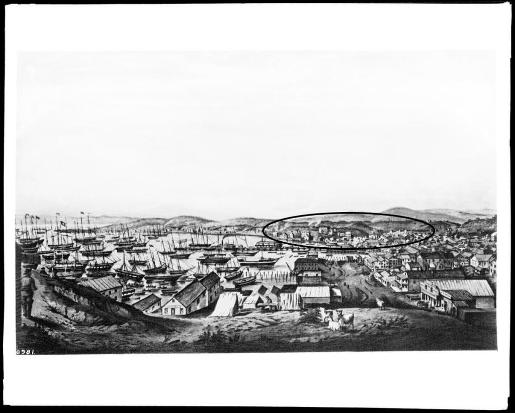 Firstly, the SOMA district at the time of the Gold Rush was one of SF’s first suburbs, a little ways south from the heart of the city (Portsmouth Square), as it exploded during the Gold Rush. This suburb, at that time, was known as Happy Valley, and was made up of cottage homes with land around them to the lot, mostly sand dunes and chaparral. [See drawing circa 1850 down at bottom of post.] It wasn’t urban by any measure, and as seen from William Eddy’s 1849 expansion of Jasper O’Farrell’s initial plat (see above), the first alleys in the area (in some cases access for horse and buggy or due to topography of area), between Market and Mission, were Jessie and Stevenson streets. I’m sure Jessie Street has been said to be named after a prostitute at some point since, but it was named for Jessie Benton Fremont, who during the Gold Rush lived in San Francisco, was the daughter of a well-regarded Missouri senator, and married to John C. Fremont, who was famous for his western explorations, as well as his Bear Flag antics during the beginning of the Mexican-American War, among other things. Also of note, Fremont went on to become the first Republican candidate for President in the United States in 1856. Stevenson Street was named for another somewhat famous San Franciscan of the era, Jonathan D. Stevenson, who had led the First Regiment of New York Volunteers during the Mexican-American War that came to California, and was therefore an early settler of SF before the Gold Rush, living in a house up around the SW corner of California and Stockton streets today. The other alley down in this vicinity on Eddy’s 1849 map, roughly running between First and Third, Howard and Folsom, is Clementina Street. That street is named for the ship Clementina that was a well-known ship at the middle of the 19th century, in fact, it had been the ship that brought John Sutter to Yerba Buena in 1839.
