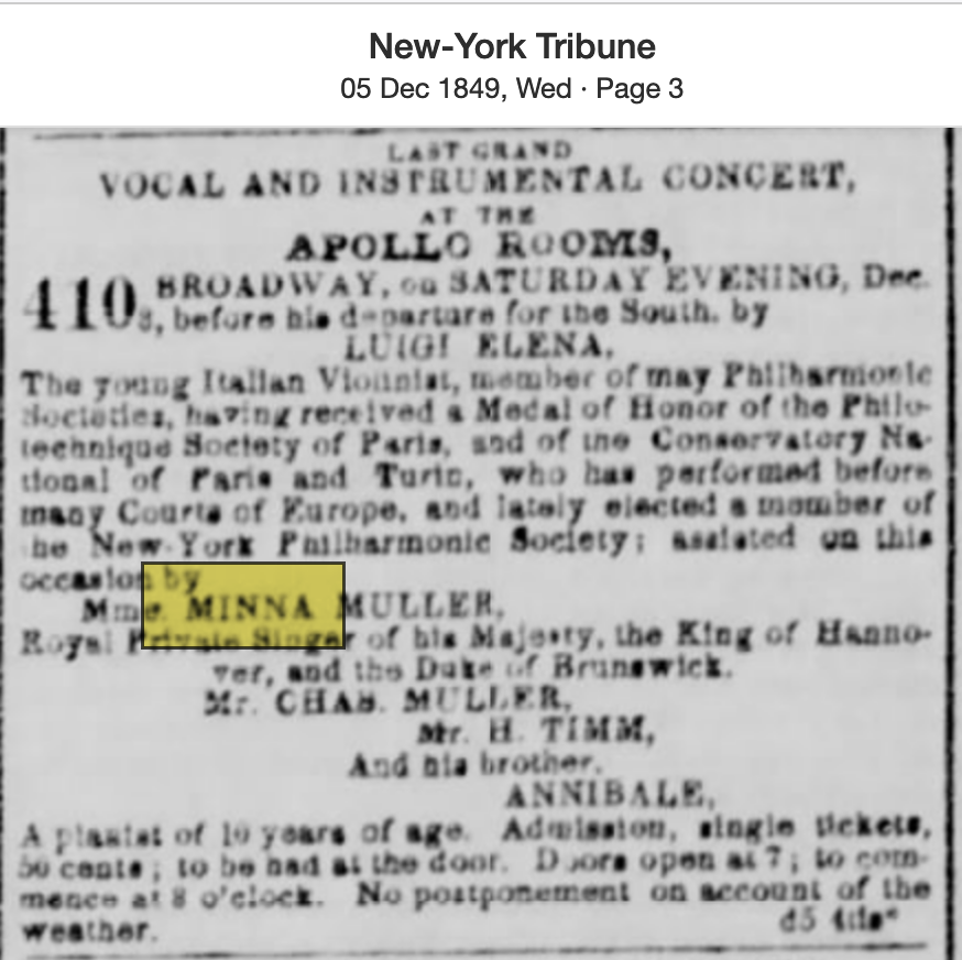 Searching NYC papers (note you cant really search SF papers in 1849 because they were mostly all shut down until the very end of the year), I found there was an active bark ship called the Minna that’s main port was in Bremen, Germany; furthermore, after more digging, I’ll bet you another 100 gold pieces that that ship was named for Minna Muller who at the time was the Royal private singer of the King of Hanover/Duke of Brunswick. She traveled and performed in NYC in 1849. Singers like Minna were world famous during this era, for instance see Jenny Lind of Sweden (One of SF’s first/main theaters was named after her though she never came to SF). Could have been there were some German settlers in the area, as well (I’m pretty sure there were German farmers settled in the SOMA area (nearer the Mission) in the Yerba Buena days, so makes sense, but don’t make me pull my Bancroft books down right now). It may seem crazy today that a good ole Google search basically pulls up nothing for Minna Muller, but she’s just lost to history, like many others. But given the time and circumstances and reality? That’s who Minna Street is named for, versus some mysterious courtesan.